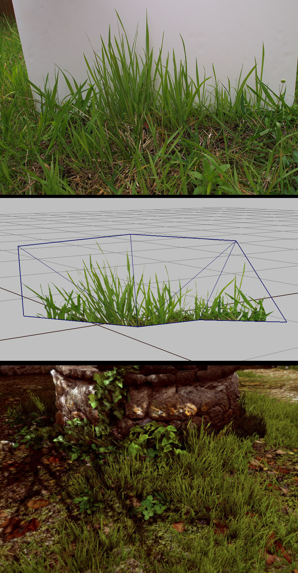 Finally I’ve started implementing better vegetation in the game. It will improve before the release of course but I thought you guys might get a kick out of knowing that a lot of it comes from the faraway lands of… my backyard. Here’s a picture detailing the process, starting with taking a photograph, then applying it to a model in Maya.